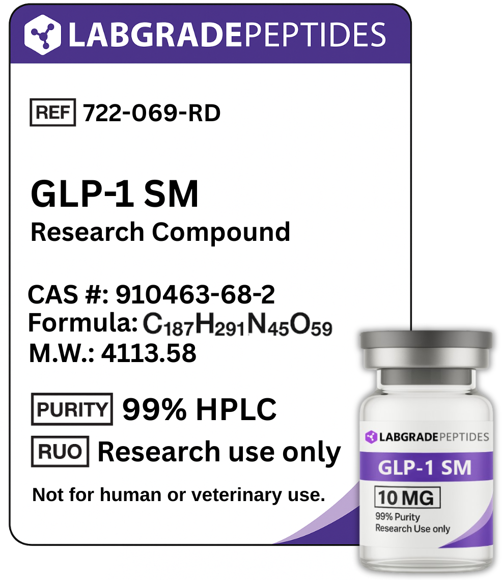 GLP-1 SM supplied for research purposes is not approved for diagnostic, therapeutic, preventative, or medical use outside of its regulated pharmaceutical labeling. No conclusions regarding safety, efficacy, or clinical outcomes are established for research-grade material.